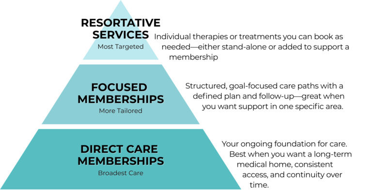 A deeper, root-cause approach for complex or persistent concerns—built around longer visits, advanced testing when appropriate, and a personalized plan that evolves as we learn what works for your body.
