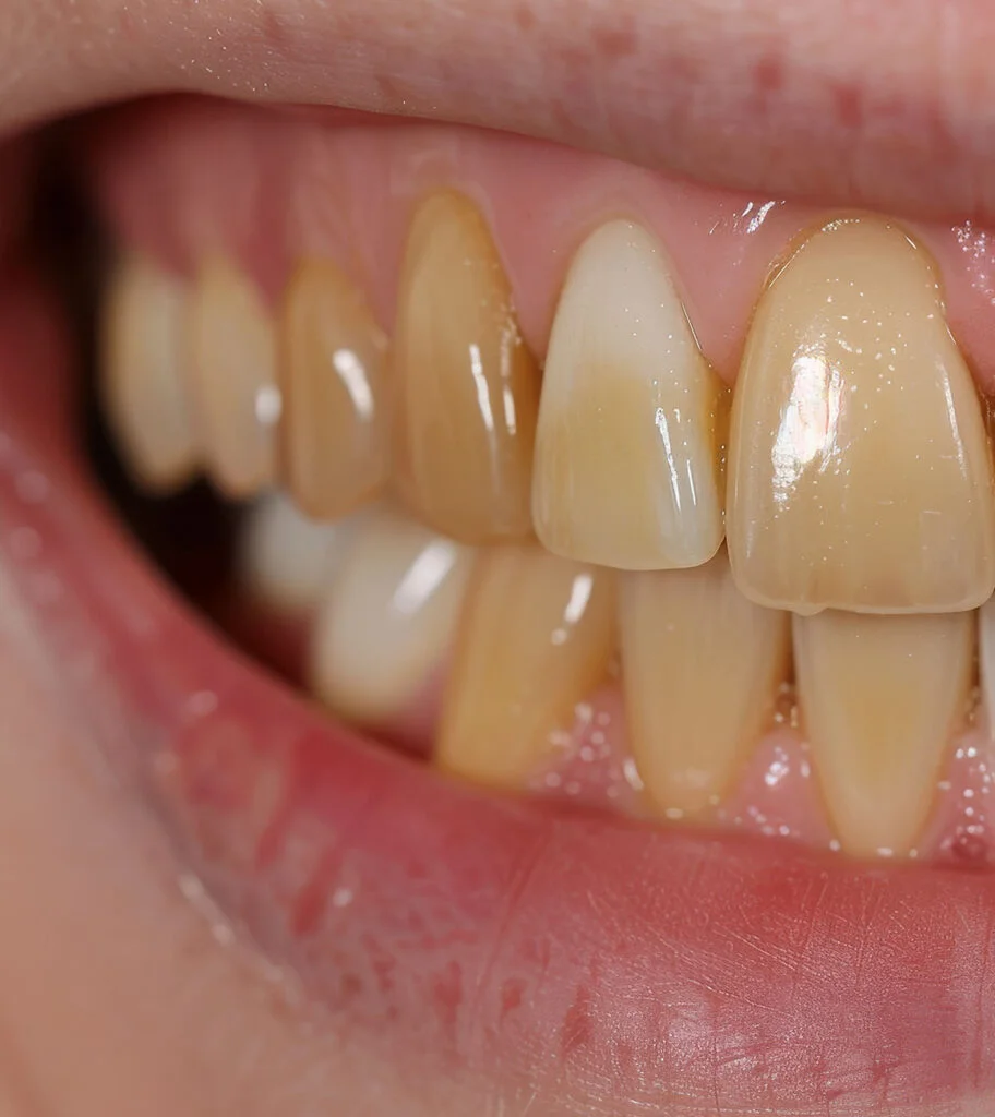 Poor oral hygiene leads to staining and a dull, uneven tooth color.